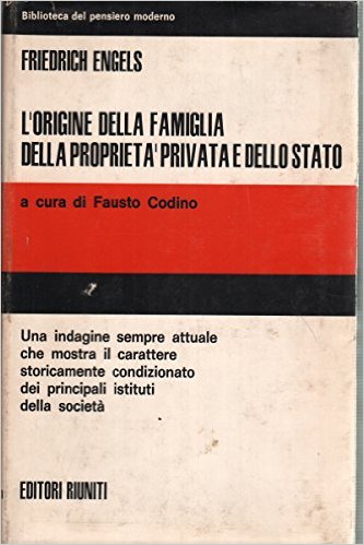 [4] F. Engels, Origine della famiglia, della proprietà privata e dello stato, Robin editore, 2015 (ma si può scaricare on line gratis). Engels scrive la sua opera nel 1884, Marx è morto l’anno prima e da gli ultimi anni della sua vita di pensatore, mentre l’amico lo pressava inutilmente e già da tempo a finire il terzo volume del Capitale e revisionare il secondo per darlo alle stampe, ci provengono i Quaderni Antropologici (Unicopli, 2009). Marx appuntava la lettura di Ancient Society (la mia edizione è un Feltrinelli del ’74 ma c’è una edizione Pgreco 2013) di L. H. Morgan che è anche la base del testo di Engels. Morgan, il cui testo era del 1877, sosteneva una tesi assai vicina al materialismo storico pur, probabilmente, senza conoscere l’opera di Marx che sull’argomento si era espresso ben precedentemente.