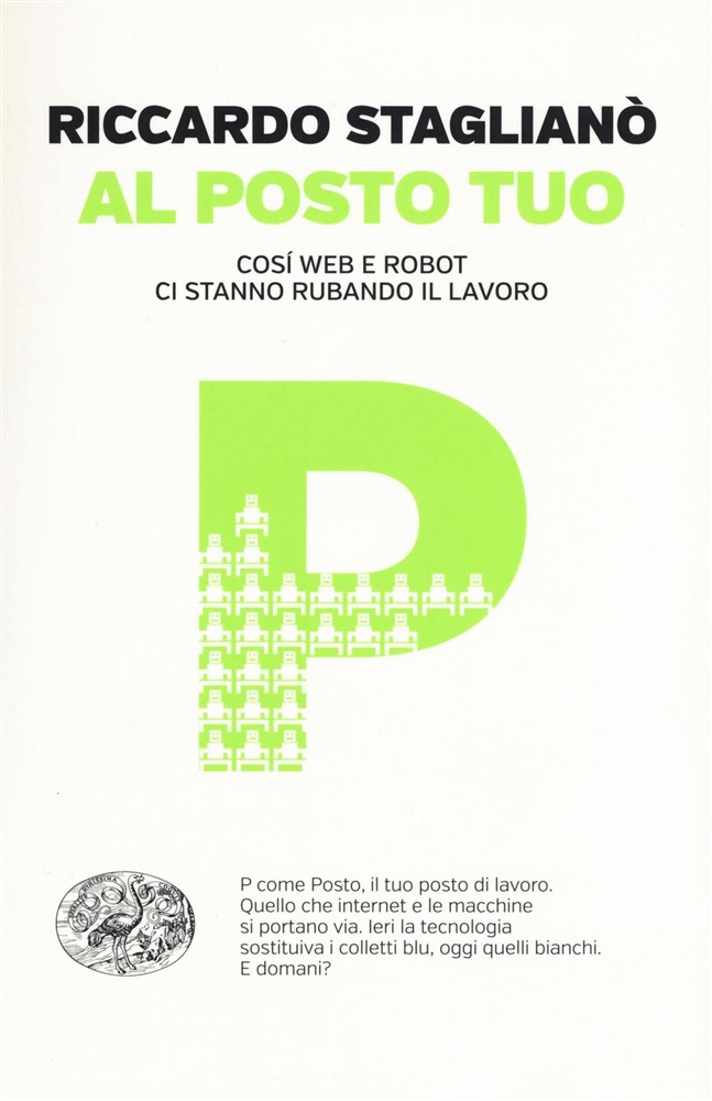 Il libro inchiesta di Riccardo Staglianò, Al posto tuo. Così web e robot ci stanno rubando il lavoro, Einaudi, Torino, 2016, è un competente ed onesto lavoro sul tema, una aggiornata overview sul fenomeno su cui l’autore, già centrato da anni su i temi delle nuove tecnologie, ha raccolto informazioni negli ultimi cinque anni. La posizione di Staglianò è critica verso il tecno-entusiasmo[5] e cerca di indagare fattivamente quanto il fenomeno sia in effetti preoccupante[6], soprattutto in via previsionale.