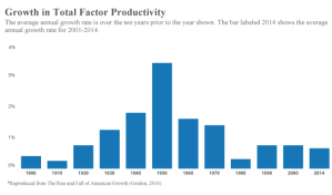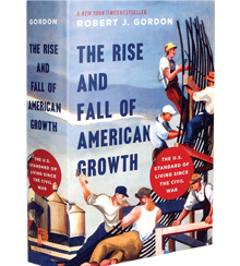 L’argomento che qui trattiamo è la tesi sostenuta dall’economista e storico americano Robert J. Gordon, nel suo celebre “The Rise and Fall of American Growth” (Princeton University Press, 2016), beneficiato di non so quanti premi editoriali, critiche molto rispettose e giudizi altrettanto ossequianti da parte di K. S. Rogoff e di L. Summers, nonché da premi Nobel quali R. Solow, G.Akerlof e P. Krugman di cui alleghiamo qui una recensione tradotta in italiano. Ammettiamo di non aver letto le 784 pagine dell’originale che pare siano assolutamente godibili per le parti descrittive delle reali condizioni di vita prese con narrativa concreta e circostanziata, tanto quanto per le molte tabelle, indici, statistiche molte delle quali confezionate proprio dall’Autore a supporto della sua inedita tesi. Ci siamo riferiti ad un companion book che ne riassume le tesi (una sorta di Bignami, se ci è consentita l’analogia) ed ai molti articoli su di lui scritti, nonché alle sue conferenze, le TED (qui) ma anche la più estesa conferenza alla LSE di un’ora e mezza (qui). Alle tesi del professore della Northwestern, per quanto inedite e fuori del coro, a chi scrive, non risulta siano state opposte obiezioni forti. Certo poiché la tesi portano ad un certo pessimismo per il futuro ed essendo il futuro impredicibile in via di principio, si può apprezzare la sua ricostruzione storica e poi mantenere out look più ottimisti, ma più che certezze predittive, l’opera di Gordon è secondo noi apprezzabile in senso storico ed in quanto materializzatrice di quel fenomeno che chiamiamo economia, soprattutto per il mondo occidentale e soprattutto ora che la crescita orientale sembra mostrare fenomeni di “grande convergenza” con quella occidentale come abbiamo segnalato già qui. “Materializzatrice” sta per render concreto quel motore di bisogni che l’innovazione che traina lo sviluppo economico va a soddisfare, troppo spesso il fatto economico ci viene presentato come se non avesse riferimenti concreti, il che lo rende a-geografico, quanto a-storico, eterno presente di curve che s’alzano e scendono chissà poi perché. Ricordarci la vera storia di “chi ha fatto cosa, quando, come e perché”  ha il merito di portarci a fare il punto sul perché continuiamo ad avere dogmatica e cieca fede che il futuro sarà una qualche versione del passato. Nonché a scuotere pesantemente questa stessa fede all’ombra della quale poi s’apparecchiano i banchetti combattenti dei keynesiani vs hayekiani. A noi a cui piacciono di più i Braudel ed i Polanyi, gli Arrighi e financo i Bairoch, a noi che abbiamo più sintonia con gli economisti storici che con gli economisti a-storici, le tesi di Gordon ci hanno molto stimolato. Vediamo quindi di che si tratta.