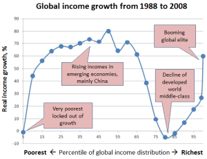 “l’elefante di Milanovic” che ha contratto la classe media occidentale in favore di quella orientale, e soprattutto beneficiato i detentori di capitale liquido, ottenibile anche a prestito con poche o nessuna garanzia se iscritti a vario titolo nell’esclusivo club delle élite. Poi, tra una avventura militare e l’altra previa stimolazione di grattacieli che crollano (dove il fatto militare è pur sempre un keynesismo travestito), di bolla in bolla, si è arrivati al crollo del 2008. Una parte della inviperita classe media americana ha mandato al potere un presidente più petro-commerciale che imperiale (premiando così una élite che stava perdendo terreno verso l’altra). In Asia, al già affermato per quanto stagnante Giappone, si sono affiancati Corea del Sud e Cina, Sudest asiatico ed ora India. Il baricentro di potenza ha cominciato a spostarsi silenziosamente ad Oriente mentre qualcuno -con rara e tempestiva lucidità- annunciava la Fine della Storia ed un Nuovo Secolo Americano.