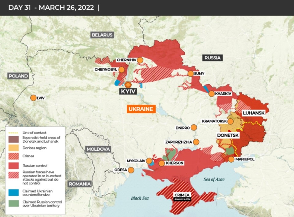 Il c.d. “conflitto congelato” che ormai pare l’unica prossima possibile tappa di ciò che vediamo e sentiamo ruotare intorno agli eventi, che caratteristiche avrà? Qui, per la prima volta da quando è iniziata questa storia, tentiamo l’ipotesi in quanto abbiamo un mese di fatti, dichiarazioni, azioni alle spalle, sebbene ancora molta nebbia davanti. L’Ucraina rimarrà a tutti gli effetti uno stato legittimo e sovrano, ma in guerra. Come tale non potrà comunque esser accettato nella NATO a meno che gli europei non vogliano firmare la loro nuclearizzazione, cosa da escludere con sicurezza. Da parte russa, quindi, per “congelare” operativamente il conflitto sul campo, occorrerà trovare la migliore posizione logistica. Infatti, se i russi avranno interesse a portare il conflitto a bassa intensità per lungo tempo visto che non potranno far altro perché gli è imposto dal vero nemico che è a Washington e non certo a Kiev, debbono mettersi un una postura difendibile al minimo prezzo visto che gli ucraini super-armati ed i loro interessati sponsor, non desisteranno mai.