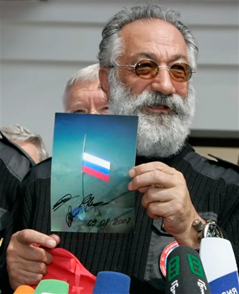 [Il famoso scienziato polare russo Artur Chilingarov tiene una foto della bandiera russa piantata sul fondale oceanico polare al suo arrivo all’aeroporto Vnukovo di Mosca, nel 2007]